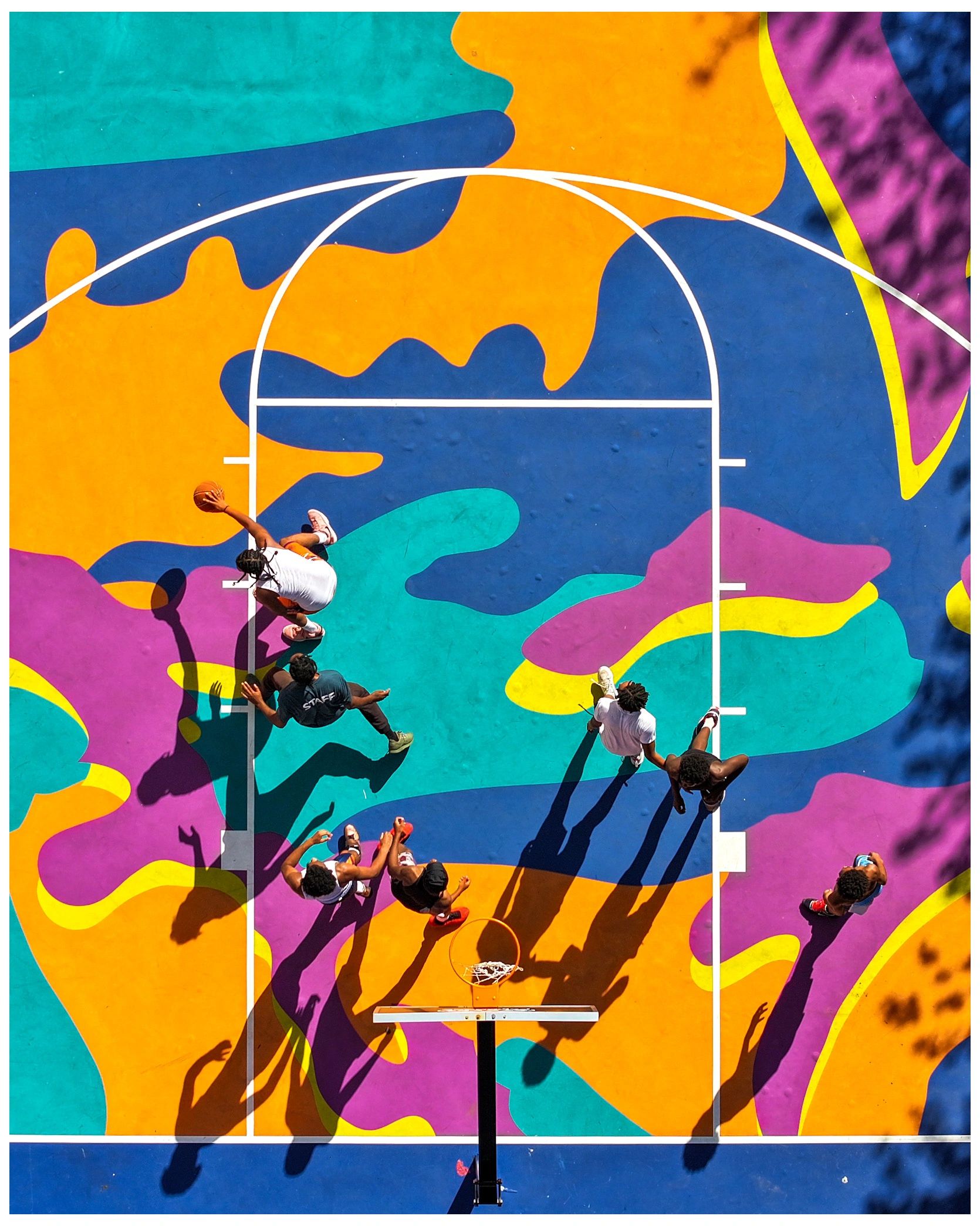 In September of 2025, Project Backboard, with licensing permission from the The Andy Warhol Foundation for the Visual Arts Inc, renovated the Lower East Side Playground basketball court with a Warhol Camouflage print. The chosen print contained no militaristic greens or tans. The terrestrial pattern of Warhol’s camo consists of royal blue, sea green, purple, pale orange and bright yellow. It looks like Rust-Oleum colored tree bark. Urban camouflage for the inner city youth who are still figuring it out.